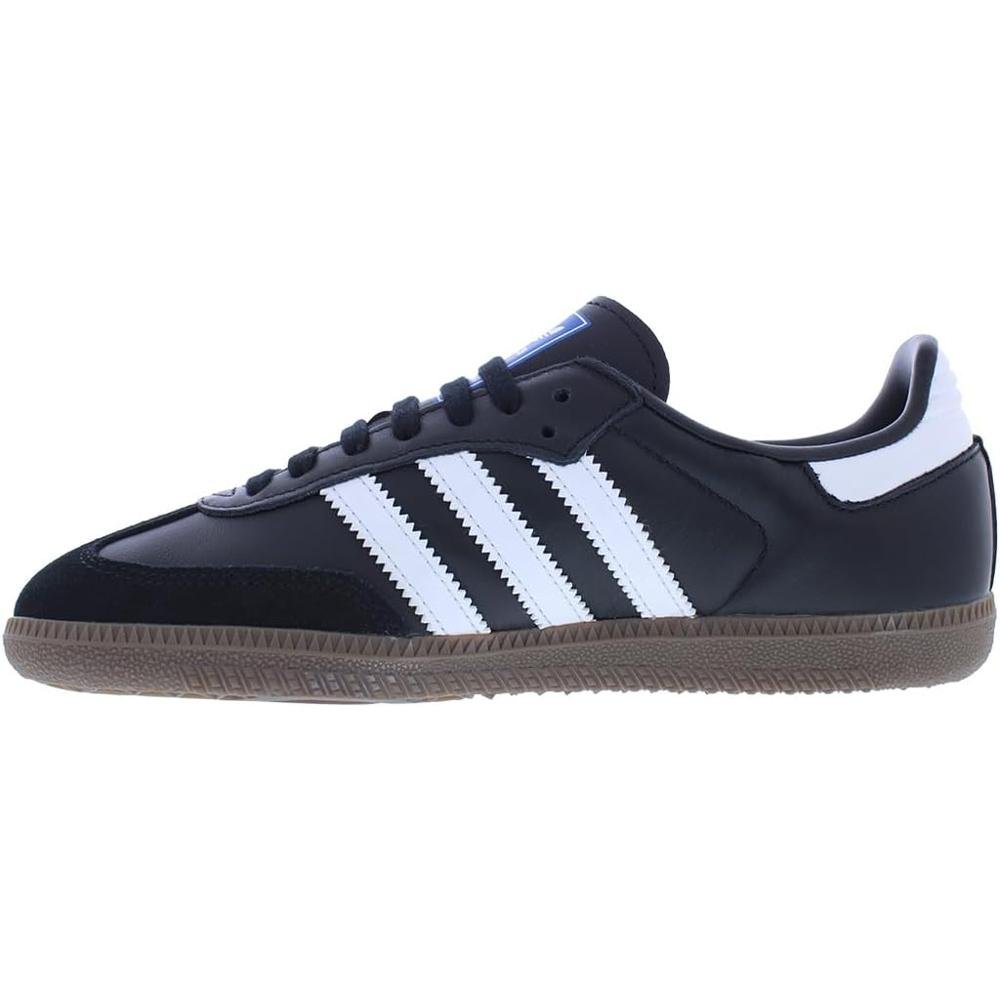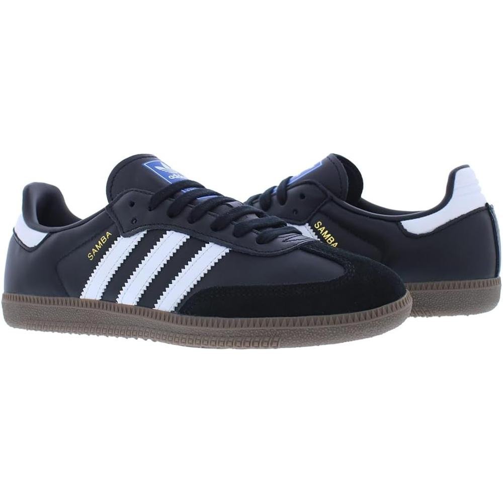- נעל אדידס סמבה שחורה קלאסית עם פסים לבנים, כיתוב 'Samba' בזהב, כיפת זמש שחורה וסוליית גומי חומה על רקע לבן